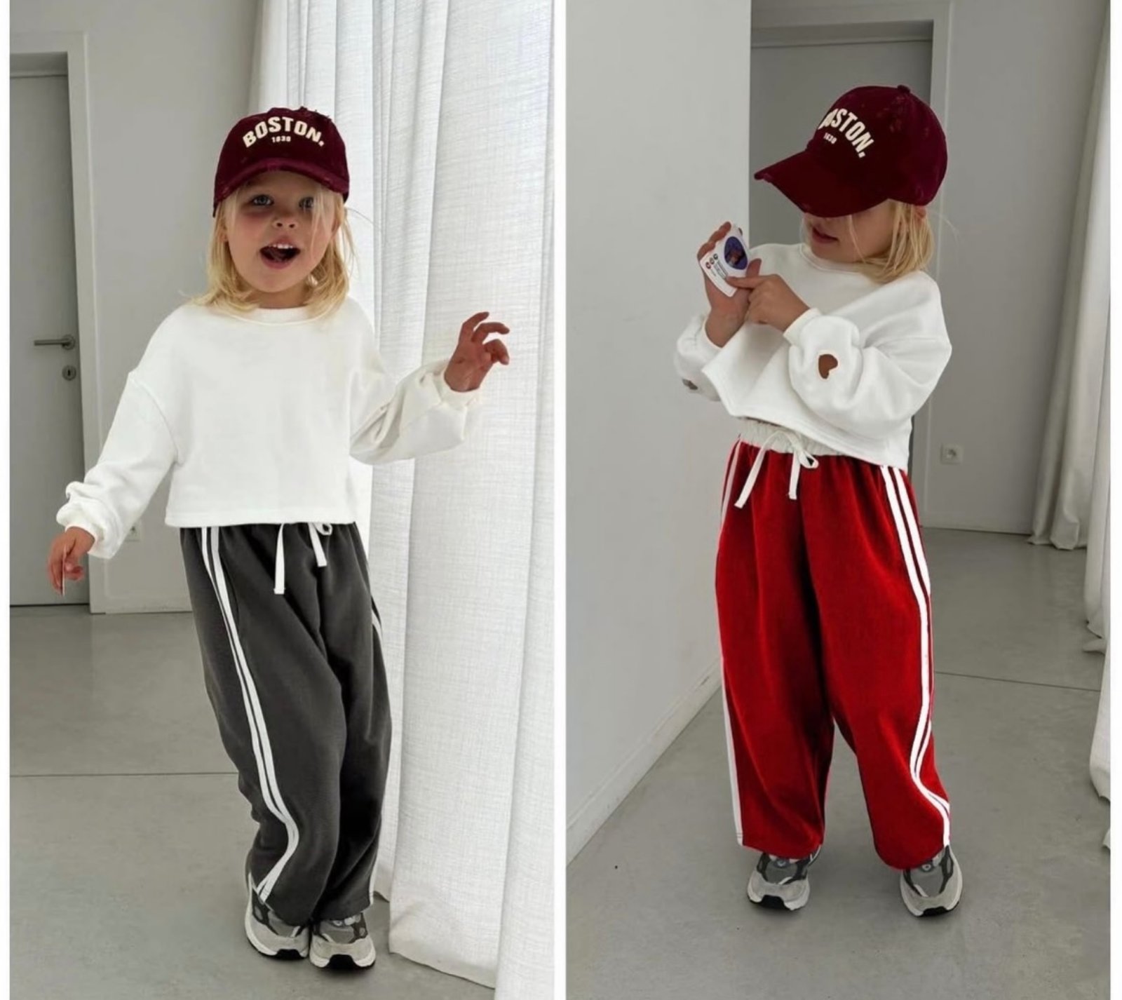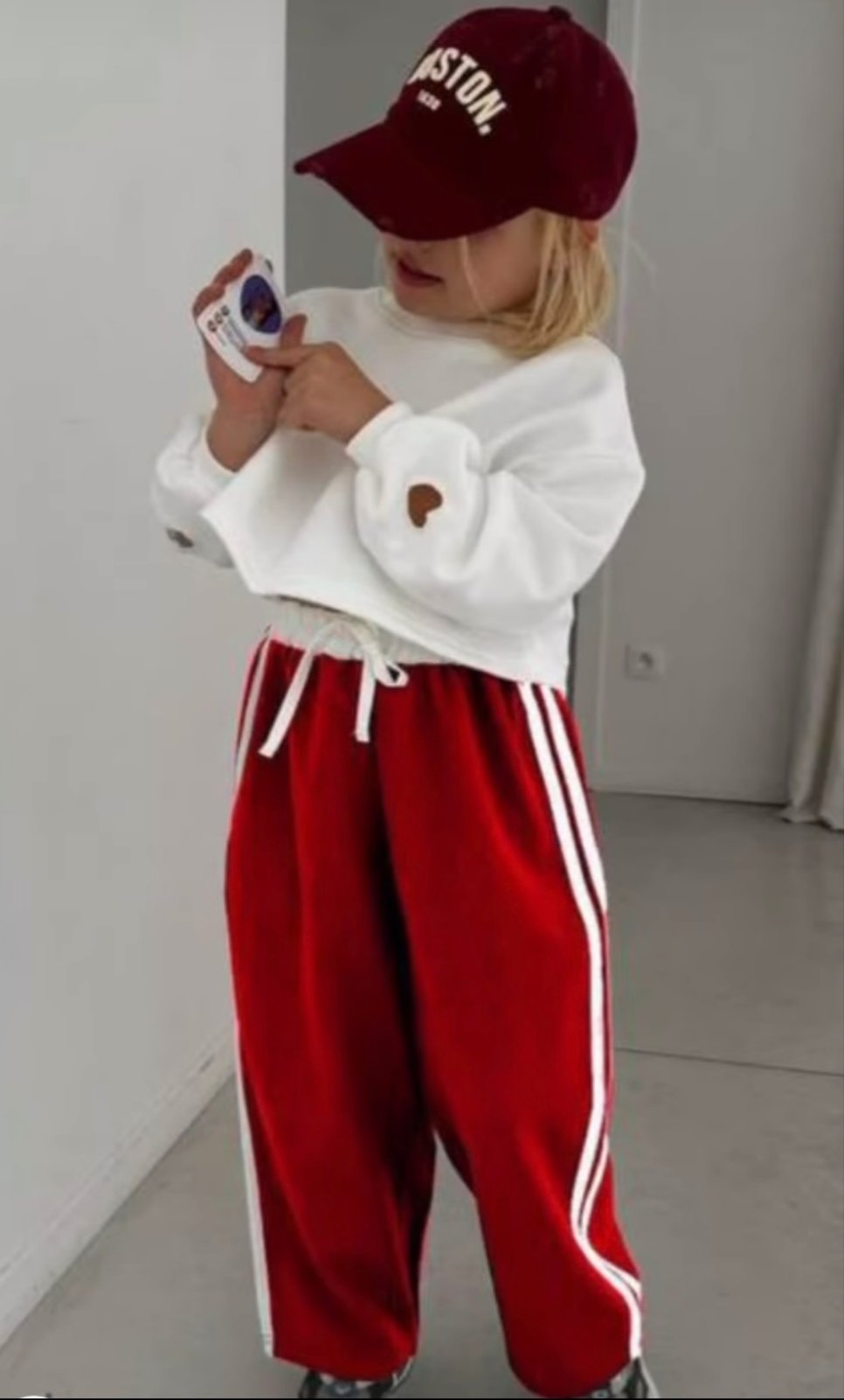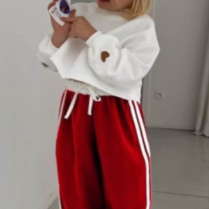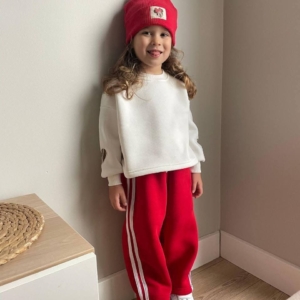 Страхотен ватиран екип с блузка в бял цвят и долничка в червено, със сърце на ръкавите. Чудесен стилен избор за важето дете!