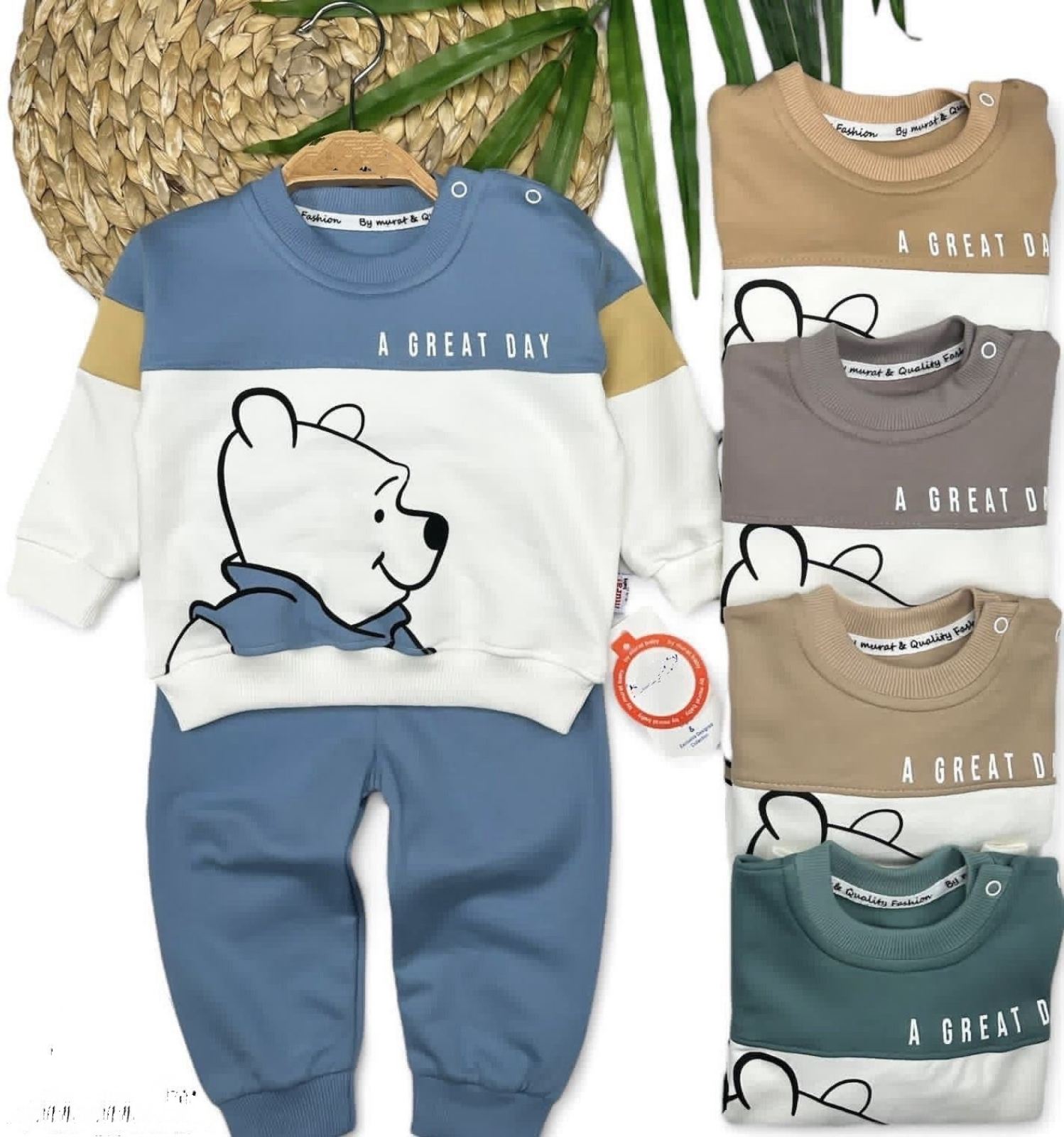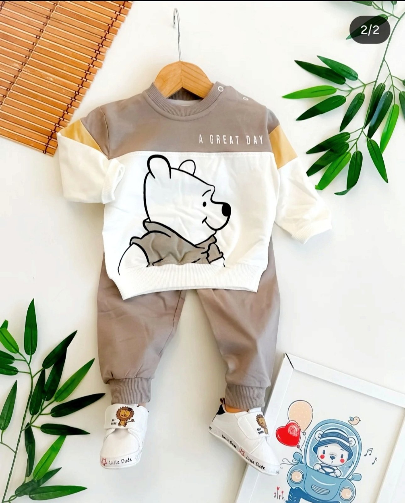 Удобно, практично и стилно комплектче от блузка и долница. Комплекта е подходящ за ежедневието, като е практичен за разходки и занимания в детската градина. Апликацията с мече допълнително го прави много актуален модел.