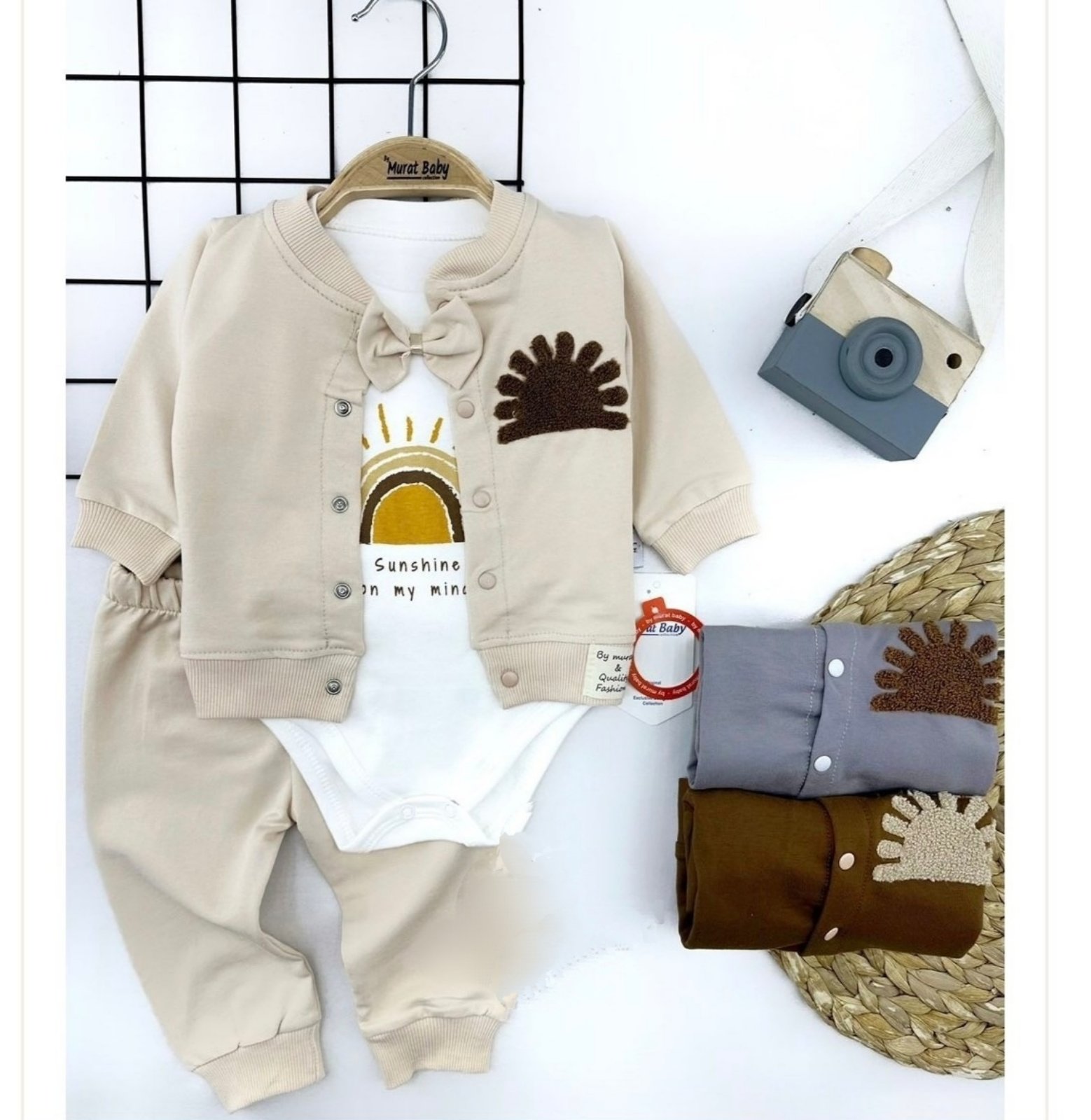 Страхотно официално комплектче от 3 части – боди, сако с паионка и панталонки.