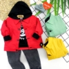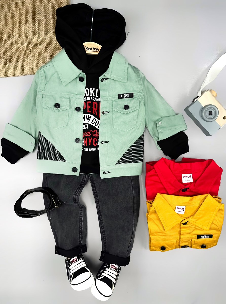 Екипчето е страхотно в, меко и удобно, 100 процента памук. Състои се от тънко яке имитация на дънково, блузка с качулка и дълъг ръкав и дънки с колан.