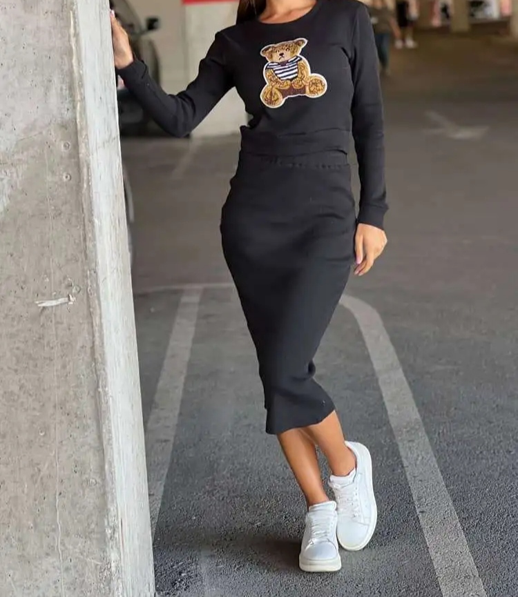 Страхотен дамски сет в черно. Състои се от пола, кроп топ блуза с мече като материята е плетиво.