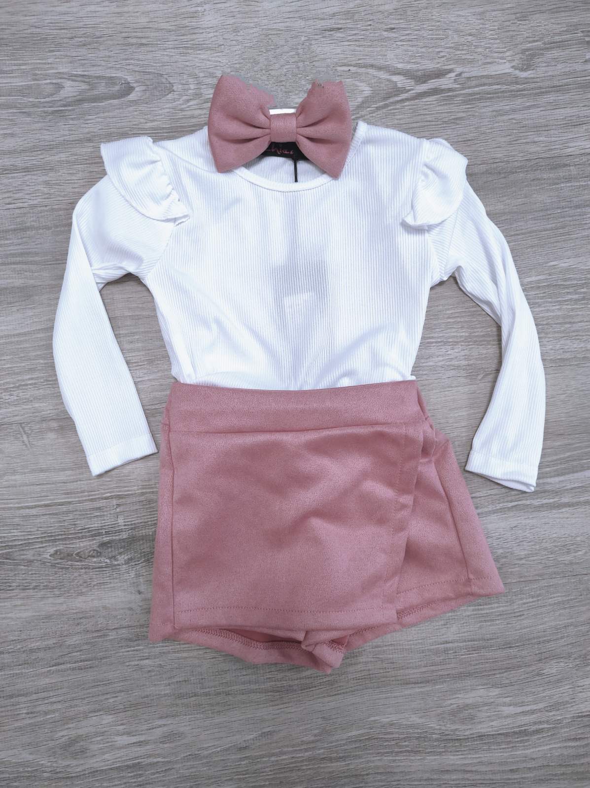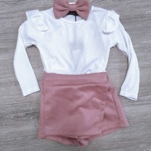 Сладурски комплект състоящ се от блузка с къдрички и пола – панталонки с прехлупване в розово. В комплекта има и панделка за глава
