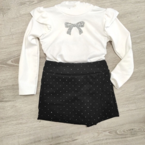 Сладурски комплект състоящ се от блузка с къдрички и пола – панталонки с прехлупване в черно с камъни.