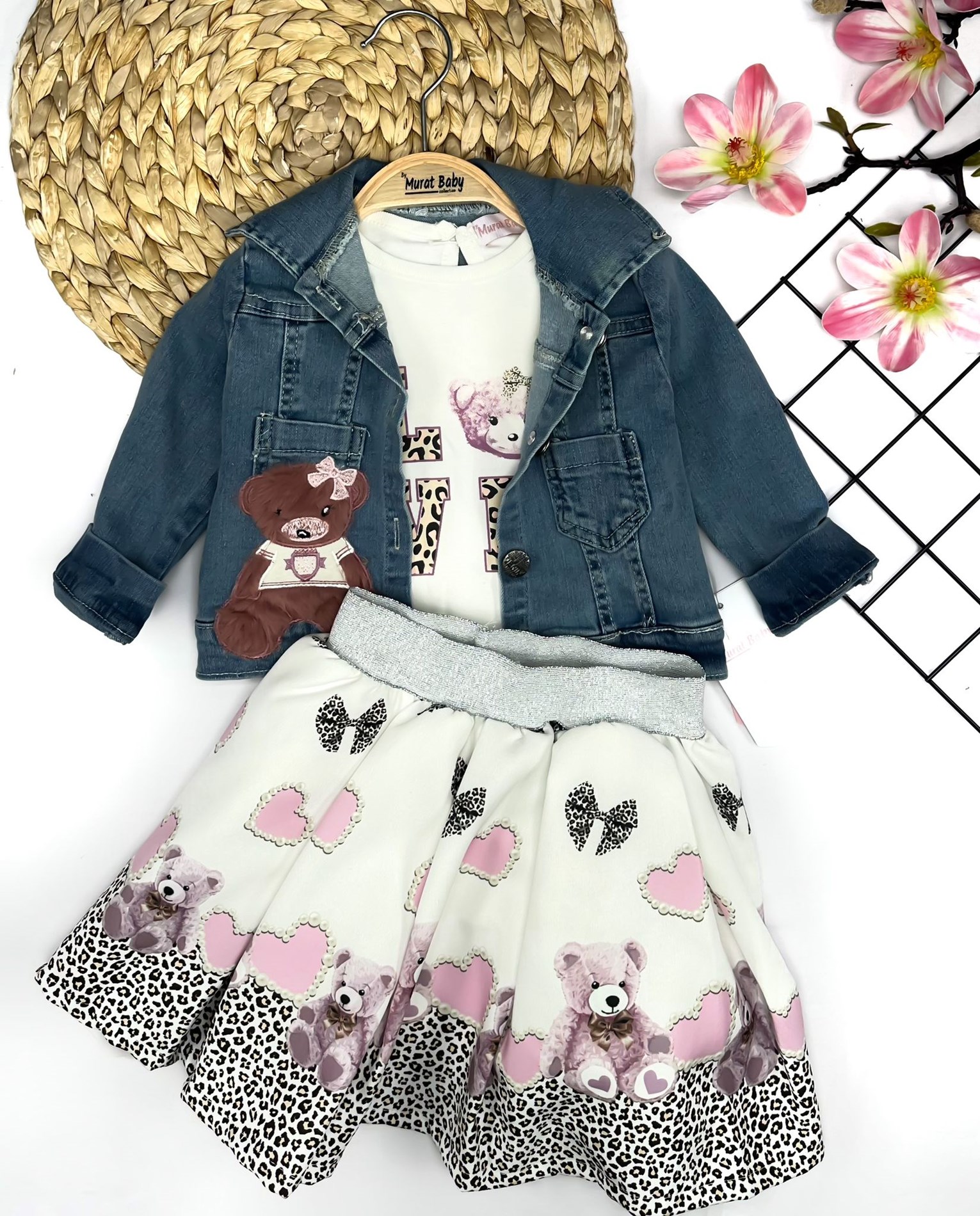 Страхотен комплект от 3 части с ефирна пола, блузка и дънково чке с мече.