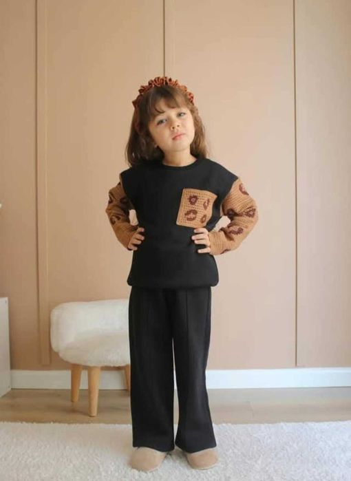 Екип от плетиво в черен цвят с интересни ръкави и джобчета. Чудесен стилен и практичен избор за вашето дете!