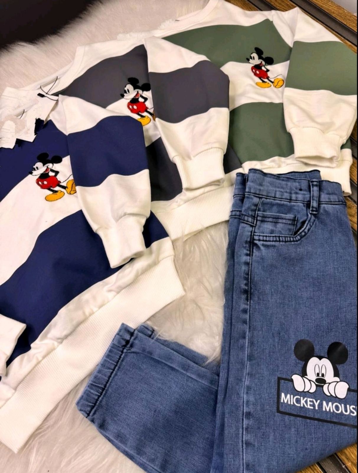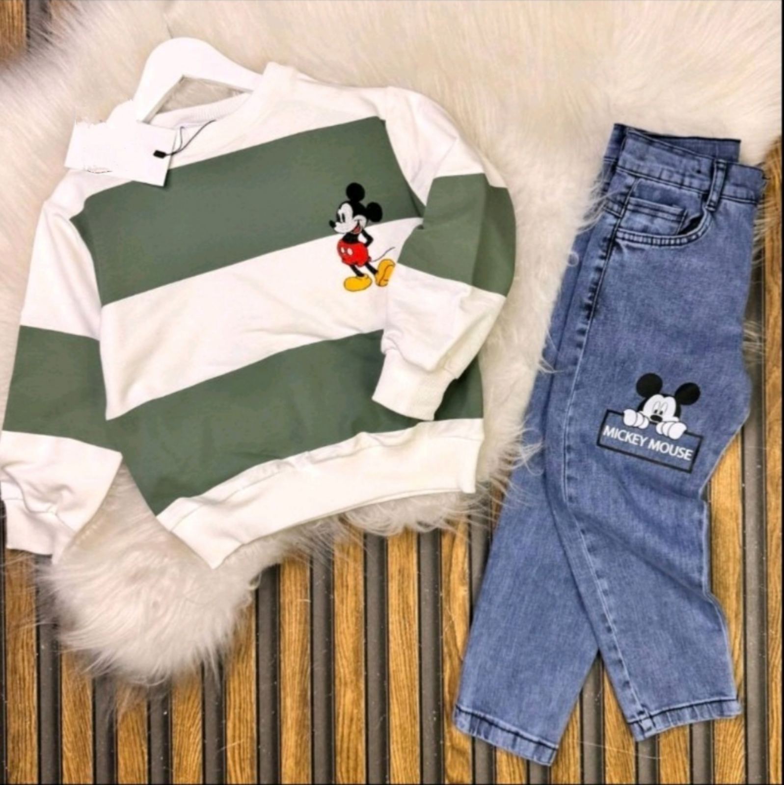 Страхотен комплект – блузка в зелено и бяло и дънки с апликация на Мики Маус. Идеален за разходки и излизания навън. Удобен и мек памучен комплект за стилни малки дами!