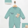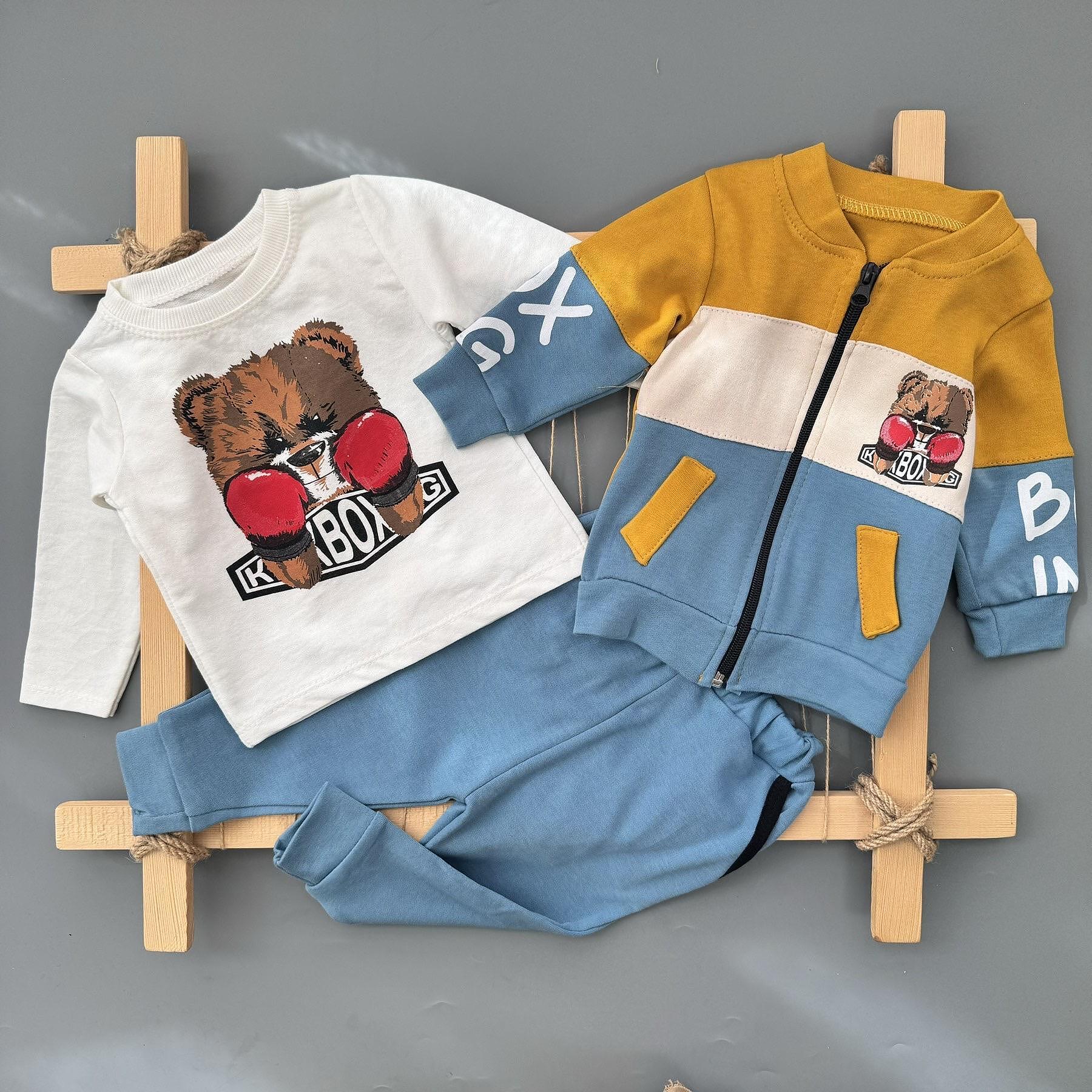 Много стилен и практичен комплект в страхотни цветове – горчица и тюркоаз, с имитация на джобчета и апликация с мече Kickboxing. Състои се от 3 части  – блуза, горница и долница. Идеален за ежедневни разходки и детска градина