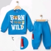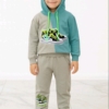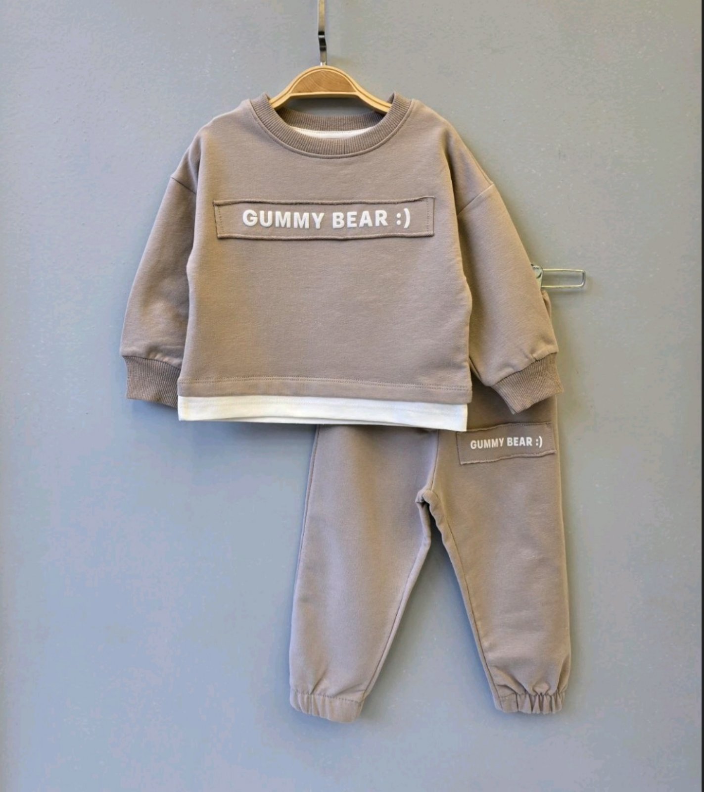 Блузата е от мека памучна материя с щампа на мече; донлицата – свободен кройка с ластик