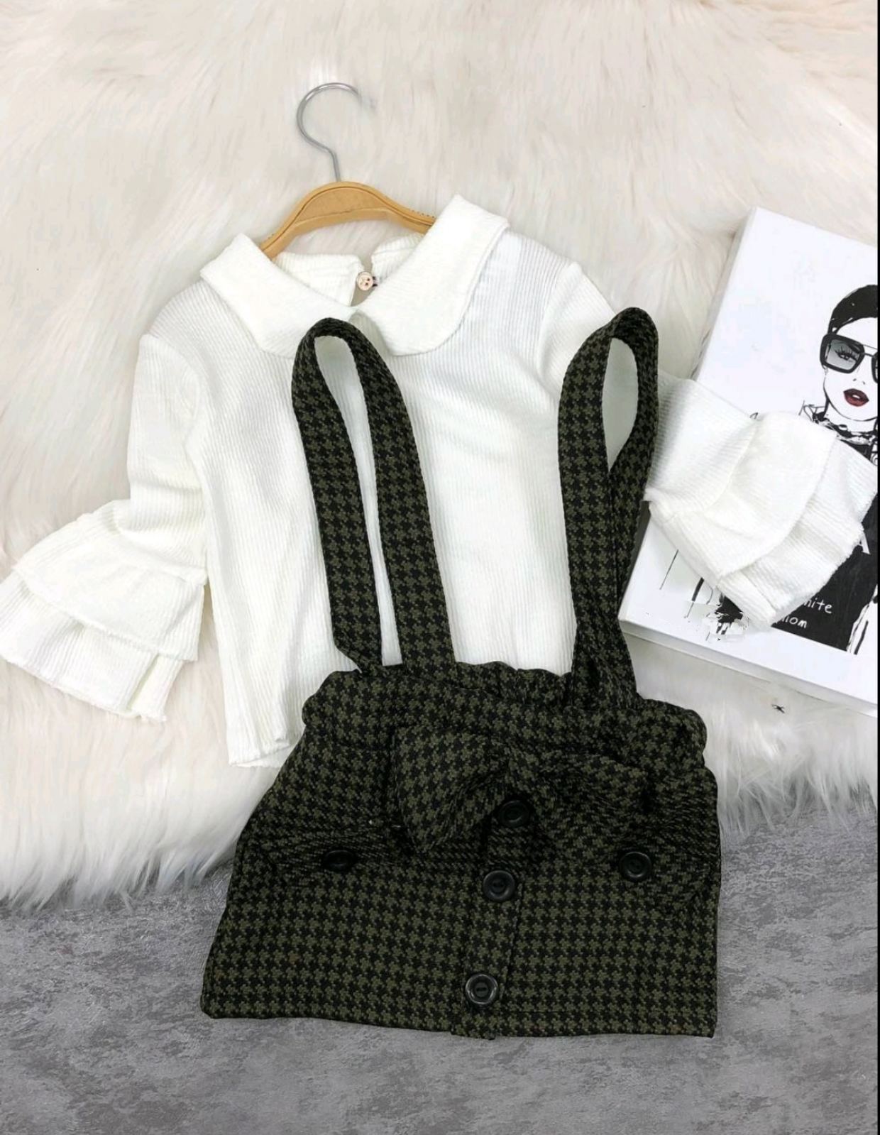 Страхотен официален тоалет. Състои се от  – бяла блузка с къдрички, карирана пола в зелено и черно с тиранти. Прекрасен избор за облекло за най-различни поводи.