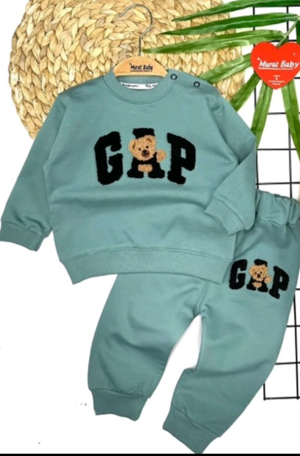Памучен комплект, който се състои от блузка и долница с бродирано меченце. Наличния цвят е тъмно син