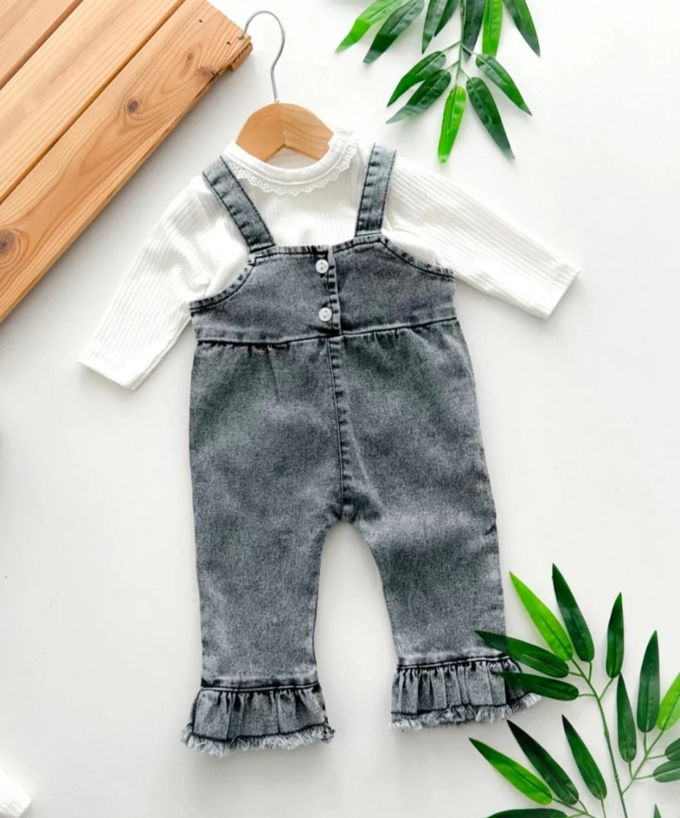 Включва блузка и дънково сукманче с широки крачоли