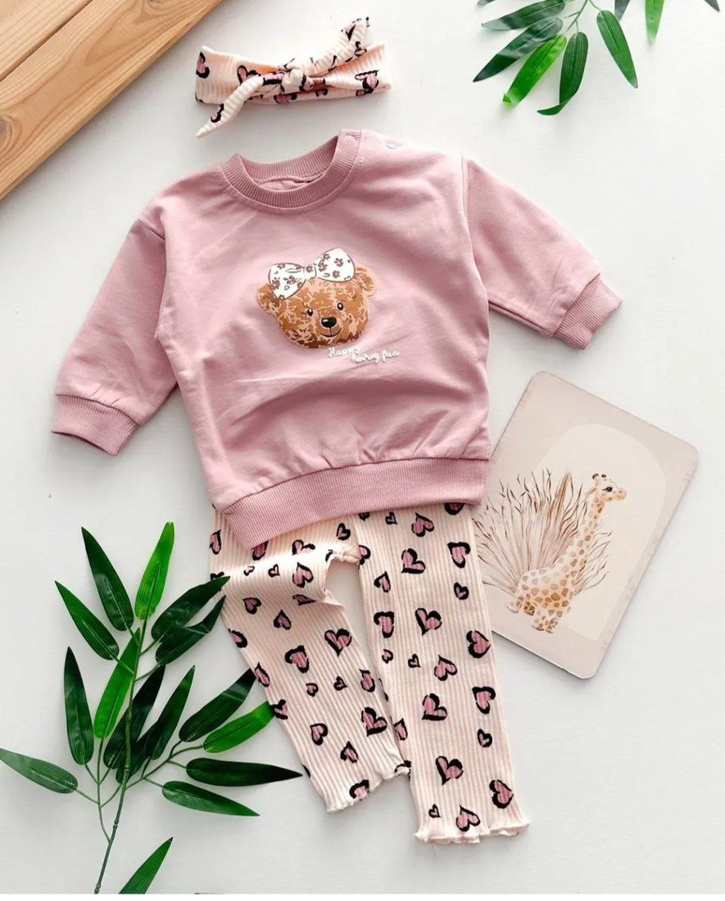 Памучен комплект, който се състои от блузка с меченце и клин,както и лента за глава.