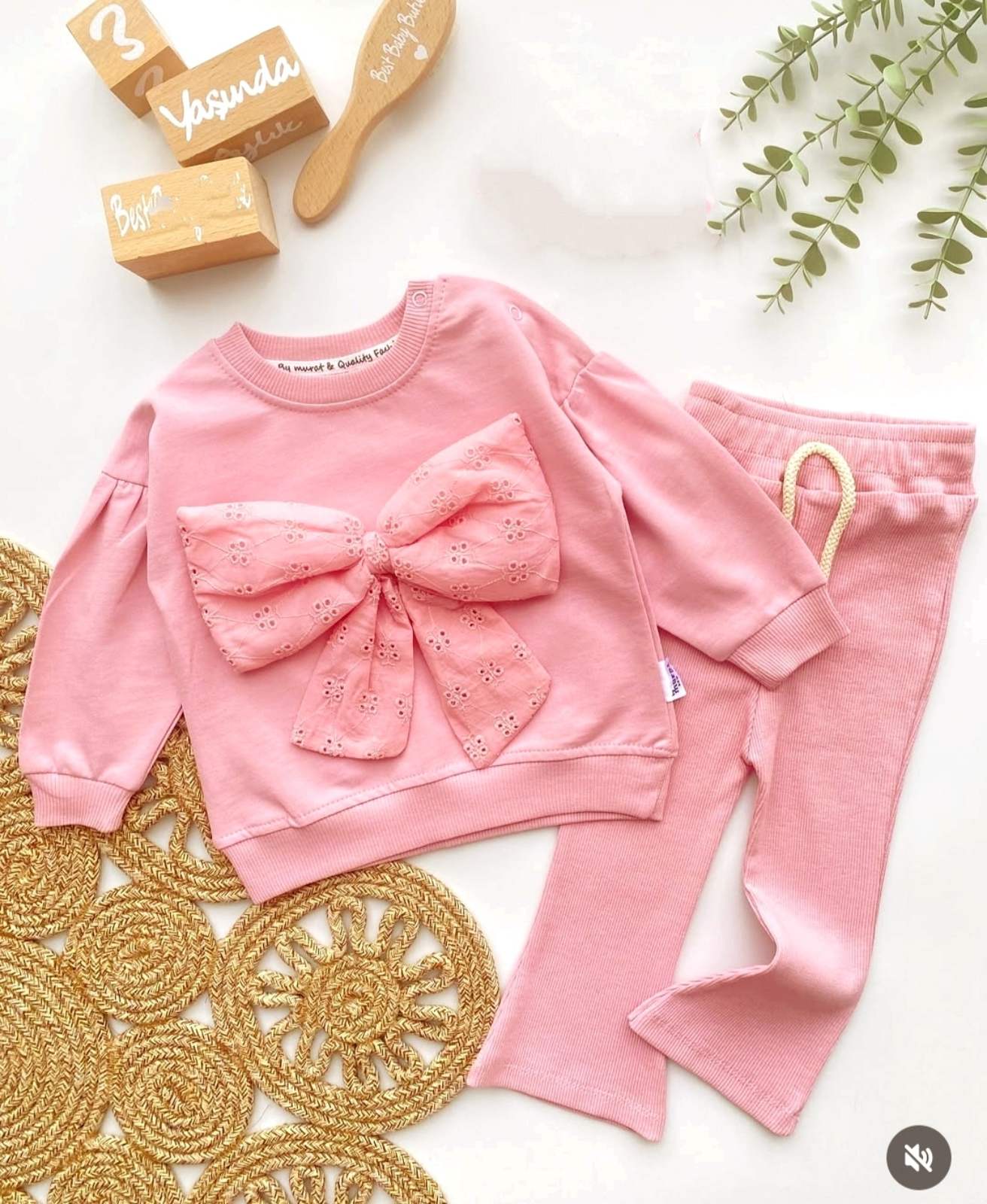 Много ефектен комплект от две части – блузка с панделка в прасковен цвят и същия цвят донлище.